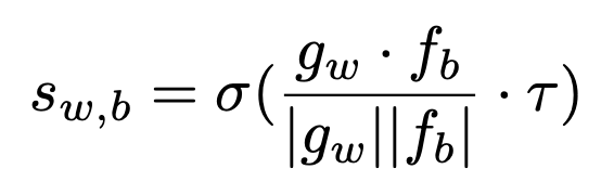 g_w와 f_b 간 cosine similarity를 사용하며, tau는 temperature 하이퍼파라미터이고 sigma는 sigmoid 함수입니다.