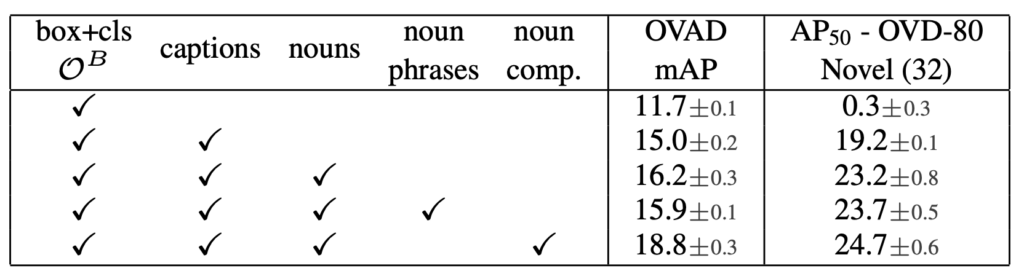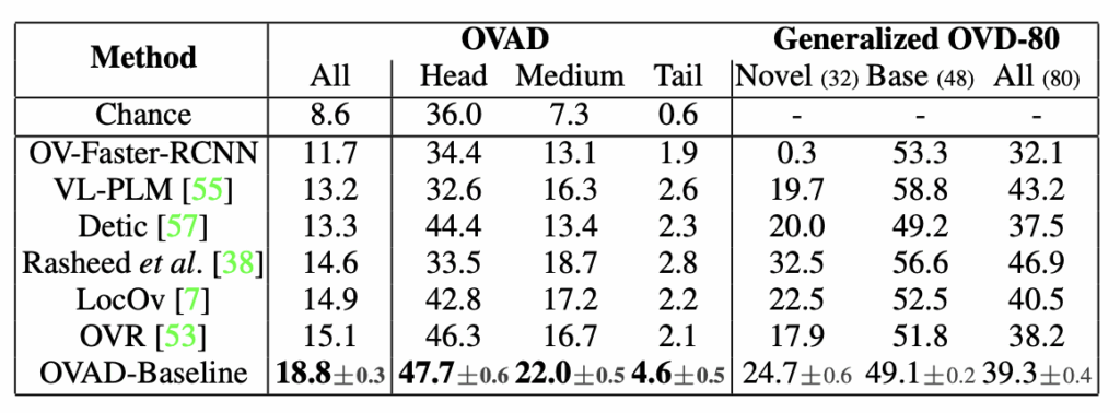 여기서 OVAD는 말그대로 OVAD(object detection + attribute classification) 실험이고, Generalized OVD-80은 object detection 성능입니다. (3.2절의 Evaluation metric (1)에 해당)