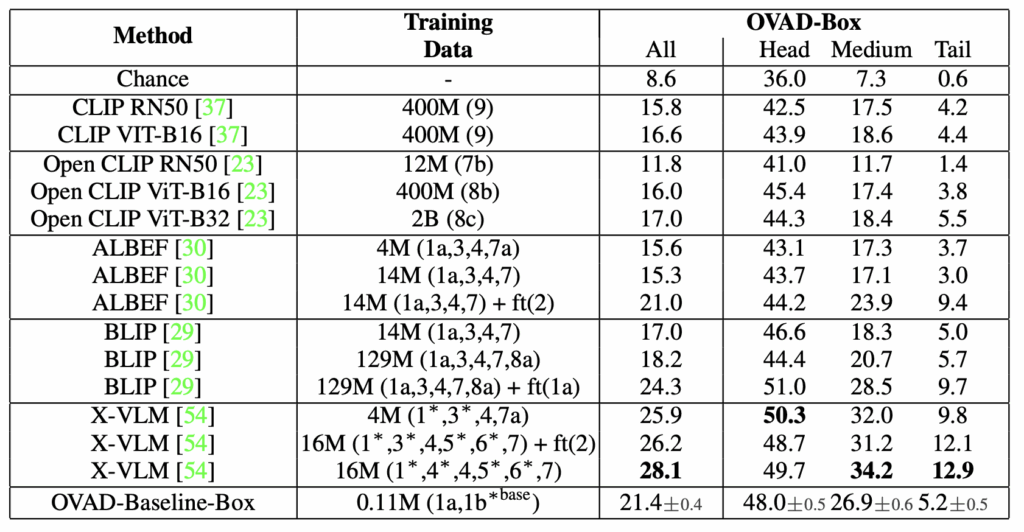 OVAD 벤치마크의 가치를 입증하기 위해, 저자는 5개의 사전 학습된 VLM의 zero-shot 성능을 비교하였습니다. 이때에는 attribute 성능만을 독립적으로 파악하기 위해 box-oracle 설정을 사용합니다.
