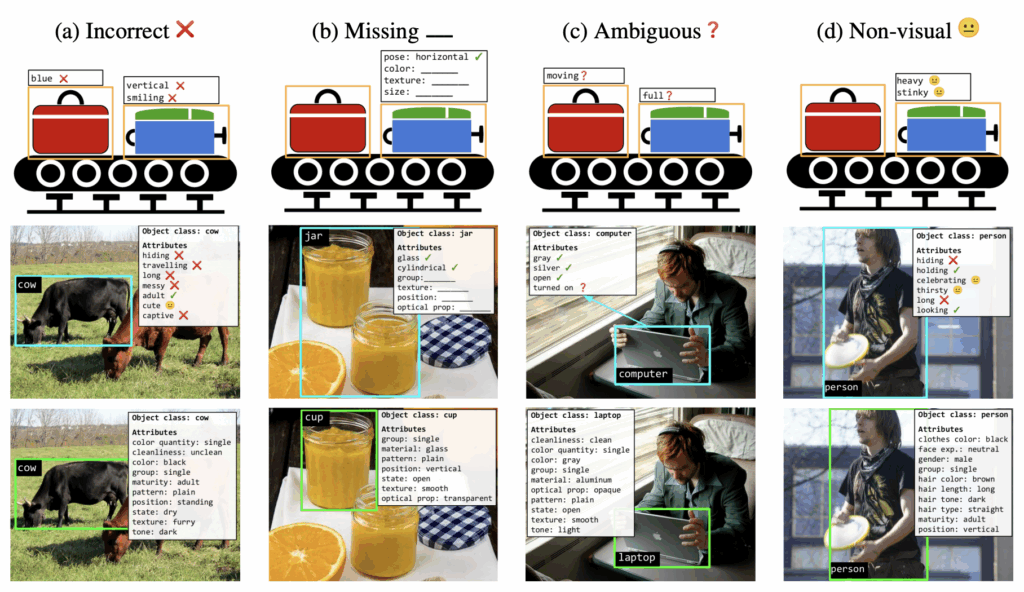 - Visual Genome: 68,000개 이상의 attribute category를 제공하지만, 각 객체에 대한 attribute는 0.74개에 불과해 매우 희소합니다.