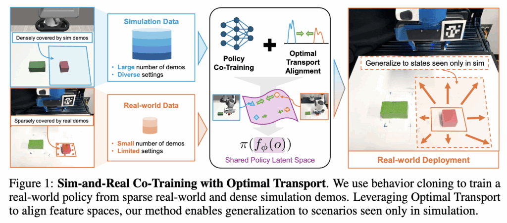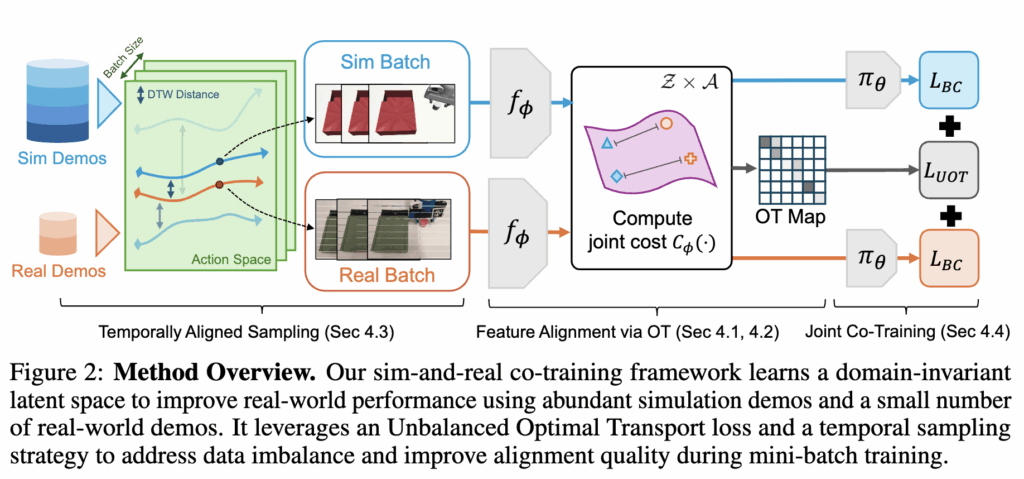 위 문제를 해결하기 위해 저자들은 co-training, 시뮬레이션 데이터의 풍부함과 현실 데이터의 현실스러움을 동시에 학습시키는 방법을 선택했습니다. 핵심 아이디어는 co-training 프레임워크를 구축하되, 기존과 같이 단순히 두 도메인의 데이터를 합쳐 학습하는 데 그치지 않고 두 도메인의 observation-action 관계 분포를 동일한 latent space에 정렬하는 objective를 명시적으로 만들었습니다. 저자들은 Latent에서 시뮬레이션과 현실의 유사한 상태들이 서로 가깝게 위치하도록 만들어 observation과 그에 대응하는 action의 joint distribution를 정렬하면 더 풍부하고 task-relevant한 신호를 학습할 수 있다고 주장합니다. 예를 들어 같은 작업을 수행하는 시뮬레이션 장면과 현실 장면이 있다면, 두 장면을 단순히 픽셀 단위로 비슷하게 만드는 것이 아니라 “로봇이 취해야 할 행동”까지 고려해 latent space에서 정렬하면 policy가 두 domain에 공통된 특징 (집중해야 하는 부분)에 주목하게 된다는 것입니다. 이를 구현하기 위해 저자들은 Optimal Transport에 영감을 받은 손실 함수를 만들고 더 나아가 대량의 시뮬레이션 데이터와 소량의 현실 데이터 간의 심각한 데이터 불균형 문제를 다루기 위해 UOT 기반으로 확장했다고 합니다. 그 결과, 아래 Figure 1과 같이 소수의 현실 데모만으로도 풍부한 시뮬레이션 데이터를 활용하여 현실에서의 success rate를 30%까지 향상시켰으며, 나아가 시뮬레이션으로만 학습한 상황에서의 zero shot sim to real 또한 실험으로 입증했습니다.