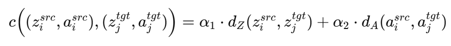 Optimal transport는 두 확률분포 사이의 Wasserstein 거리를 최소화하는 매핑(transport plan)을 계산하는 수학적 프레임워크로, 해당 연구의 입장에서 생각해보면 시뮬레이션과 현실 데이터의 observation 임베딩 z와 action의 분포 간의 거리를 줄이는 데 활용됩니다. 핵심은 분포를 옮길 때 단순히 visual적인 유사도만 보는것이 아닌 행동까지 포함한 cost 계산식을 통해 유사한 행동을 해야하는 두 도메인의 state들을 latent space에서 가깝게 해주는 것입니다. 이렇게 하면 인코더가 도메인에 관계없이 유사한 로봇 행동을 이끌어낼 수 있는 시각적 특징들을 뽑아내도록 훈련되고, 결과적으로 정책이 시뮬레이션과 현실 모두에서 일관되게 작동할 수 있습니다.구체적으로, 시뮬레이션 데이터 집합 D_src = {(o_src^i, a_src^i)}와 현실 데이터 집합 D_tgt = {(o_tgt^j, a_tgt^j)}가 주어졌을 때, 인코더를 학습시키는 목표는 변환된 latent feature와 action의 관절값분포 P_src(z_src, a_src)와 P_tgt(z_tgt, a_tgt) 사이의 Wasserstein 거리를 최소화하는 것입니다. 워셔슈타인 거리가 비용 함수에 따라 정의되는데, 저자들은 아래 d로 z와 A에서의 거리(오차의 제곱)를 사용했습니다.