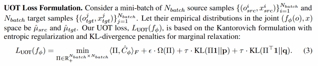 이를 해결하기 위해 저자들은 Unbalanced Optimal Transport (UOT) 기법을 적용했습니다. UOT는 OT의 제약식을 완화하여, 분포 질량이 반드시 보존되지 않아도 되도록 여지를 주는 방법입니다. (유하게 의미있는 구간만 맞춰준다고 밖에 이해 못 한것 같습니다,,) 구체적으로는, source 분포 p와 target 분포 q 사이의 OT 해법에 KL divergence 기반 페널티를 추가함으로써 unmatched mass를 허용한다고 합니다. 쉽게 말해, 꼭 모든 시뮬레이션 데이터를 어느 타깃 샘플에 대응시키지 않아도 되며, 대신 대응되지 않은 부분에 대해서는 페널티를 부여하고 넘어가는 방식이라고 합니다. 이렇게 하면 두 분포 중 정말 유사한 부분집합만 선택적으로 강하게 align한다고 하네요.저자들은 구현할 때 미니배치 단위의 샘플 집합에 대해 엔트로피로 정규화된 UOT loss를 위와 같이 정의했다고 합니다. 혹시나 궁금해하실 분이 있을까봐 캡쳐해두었습니다..