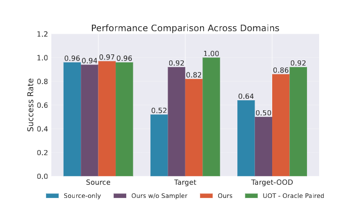 실제로 미니배치를 구성할 때는 먼저 확률분포에 따라 한 개의 시뮬레이션 trajectory와 현실 trajectory 쌍(ξ_src, ξ_tgt)을 뽑습니다. 그리고 나서 그 둘 내부에서 같은 시점대의 전환들 (o, x, a)을 몇 개씩 샘플링하여 배치를 채우고 DTW로 정렬된 시점들을 기준으로 근처 시간대의 샘플을 짝지어 뽑아 fine-grained alignment를 적용합니다. 이를 통해 실질적으로 대응되는 상태들을 학습할 수 있다고 합니다. 부록에 이에 대한 실험 결과를 첨부했는데, 실제로 OOD에서의 성능이 sampling을 사용하지 않았을 때 보다 성능이 oracle 수준 (사람이 직접 맞춤)으로 뛰어난 것을 볼 수 있습니다.