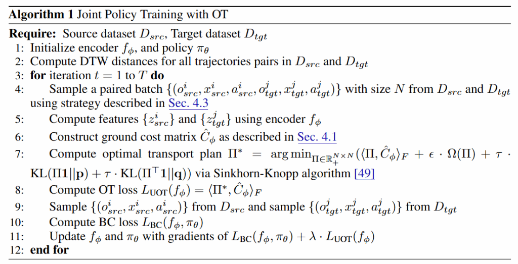 우선 인코더와 정책을 모두 초기화 해준 뒤, 시뮬레이션과 실제 환경의 trajectory 쌍 간 DTW행렬을 계산해줍니다. 이 D_src와 D_tgt는 이후 매칭 시 샘플링 전략에 사용됩니다. 이제 T번의 iteration 동안 src/tgt trajectory 쌍을 DTW 거리 기반으로 샘플링하여 페어링된 배치를 구성하고 인코더를 통해 각 trajectory의 observation, state를 latent feature로 변환한 뒤 OT cost를 구성한 뒤, 해당 비용 행렬을 최소화 하는 행렬을 계산한 뒤 UOT loss를 계산해줍니다. 이후에는 시뮬레이션과 현실에서 샘플링한 BC 데이터를 통해 인코더와 policy를 통해 loss를 계산한 뒤에 한 번에 공동으로 업데이트 해줍니다.