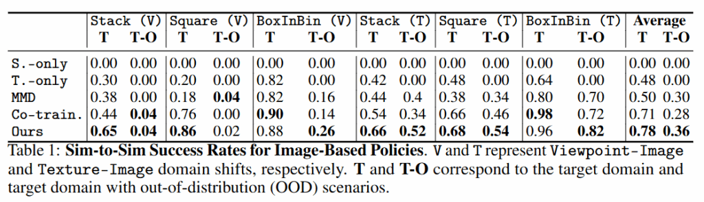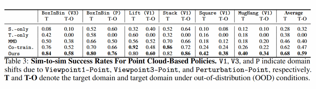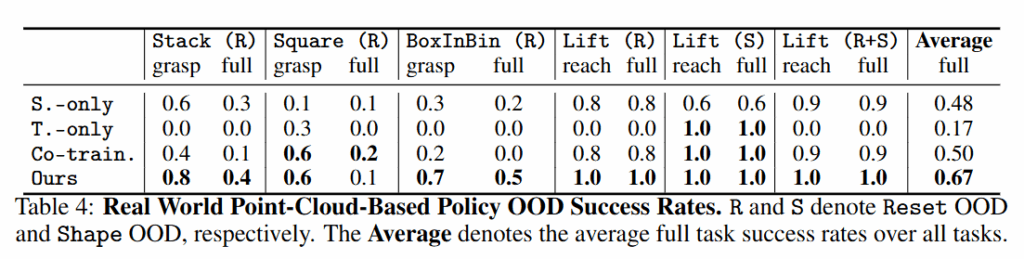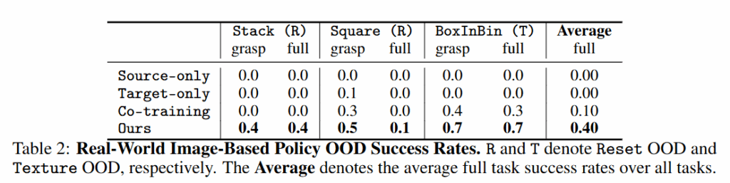 일단 RGB 기반의 Source 도메인에서의 적응 능력입니다. 저자들은 카메라 시점(V)이나 텍스처(T)가 학습 때와 달라지는 OOD 상황을 설정하여 평가했습니다 T-O가 시뮬레이션에서의 OOD입니다. 실험 결과, 현실 데이터만 사용한(Target-only) 정책이나 시뮬레이션 전용(Source-only) 정책은 OOD 성공률이 0%입니다. 이는 명확한 한계이기 때문에 어찌보면 당연한 결과라고 생각합니다. Co-training의 경우에는 Viewpoint에 대한 강인성이 아예 없는 것을 확인할 수 있습니다. 시각과 액션이 고려되지 않았기 때문이라고 볼 수 있을 것 같습니다.