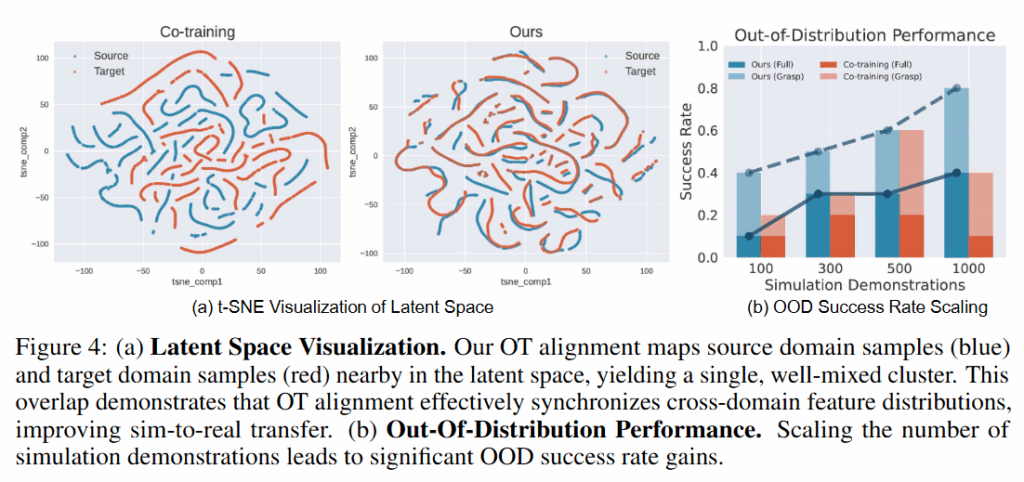 전체적으로 정리해보자면, 저자들의 OT 기반 co-training이 특히 현실에서 학습 데이터 분포를 벗어난 변화 에 대해서 공동학습 대비 훨씬 뛰어난 일반화 능력을 증명했습니다. 이러한 학습 방식이 실제로 본 적 없는 상황도 본 것처럼 할 수 있는 (행동에 대한 이해)를 한다고 생각하빈다. 또 무엇보다 시뮬레이션 데이터가 어떤 면에서 도움을 줄 수 있는지가 뚜렷하고, 현실 데이터가 적은 상황에서 Target-only 대비 크게 향상된 성능을 얻을 수 있다는 것을 확인했습니다. 위와 같이 t-SNE를 보았을 때도 정렬이 잘 된 것과 이에 따라 OOD에서의 성능이 뛰어남을 확인할 수 있습니다. 무엇보다 action을 anchor 삼아서 latent를 정렬하는 sim2real의 새로운 방향과 이를 통한 OOD에서의 성능 향상을 확인할 수 있어서 앞으로 합성데이터의 방향에 대해서 해당 관점으로 더 생각해볼 수 있지 않을까 싶습니다.