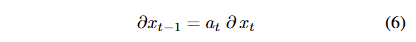 최종 reward로부터 생성된 gradient는 연쇄 법칙에 따라 back-propagation이 될 수 있으며, 이웃된 timestep 간의 gradient는 아래와 같이 표현됩니다.