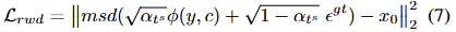 해당 수식은 기울기의 정확도를 감소 시킬 수 있지만, 제한된 메모리로도 어느정도 효과적인 학습이 가능하도록 합니다. 저자는 msd(*)를 multi-step denoising operation로 사용하며, diffusion reward는 다음과 같이 표현됩니다.